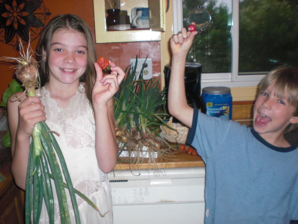 When the day is done, and I am tired as all get out. I have cooked, cleaned, gardened, and fed chickens and children. We are winding down, going to gather eggs, water the plants still in the green house, and see if there is any food yet to be harvested, and find the strawberries ripe, the lettuce full, the spinich green, the swiss chard tall, the radishes bulging from the ground and the onions starting to push up from the earth, I realize how truly blessed I am. I gather in the harvest and look at the abundance on my counters and thank God for giving us the fruit of the vine. Once apon a time, the first man was cast out of the garden and cursed to toil the earth for his daily bread. Now here I am 6000 or more years later and Jesus has died and risen again so that my work, of tilling the earth, is no more a curse, but the gift of the fresh food a rich blessing! Thank you Lord for my boutiful harvest!PhotobucketPhotobucket